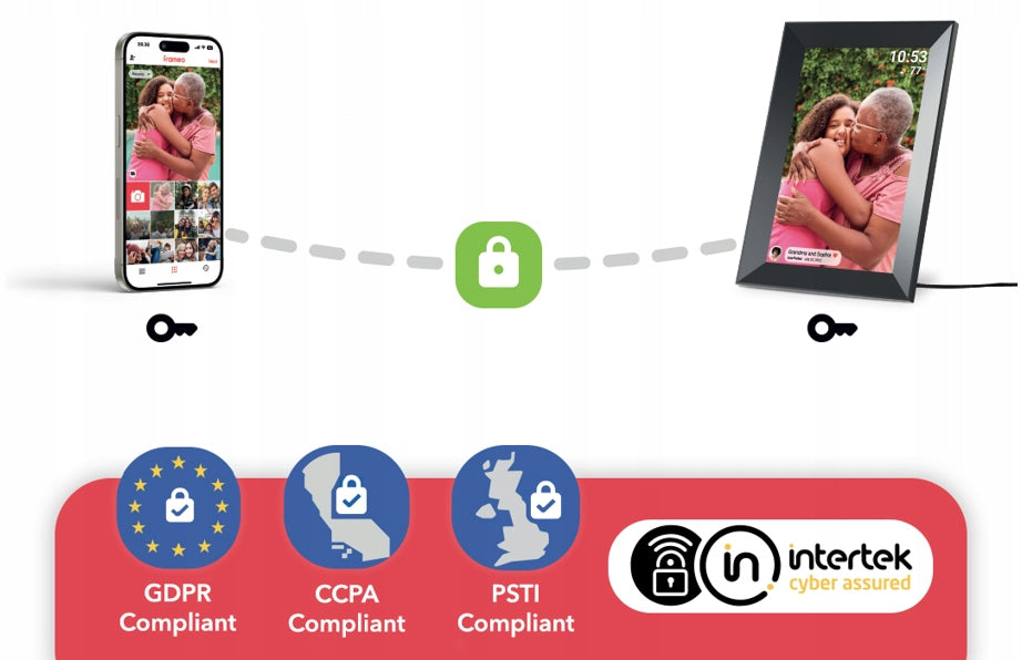 „Frameo“ programėlėje naudojama „Secure Device Grid“ (SDG) technologija, užtikrinanti visapusišką šifravimą ir saugumą, kad jūsų nuotraukos būtų privačios ir saugios.