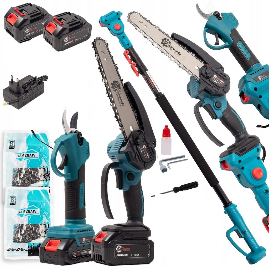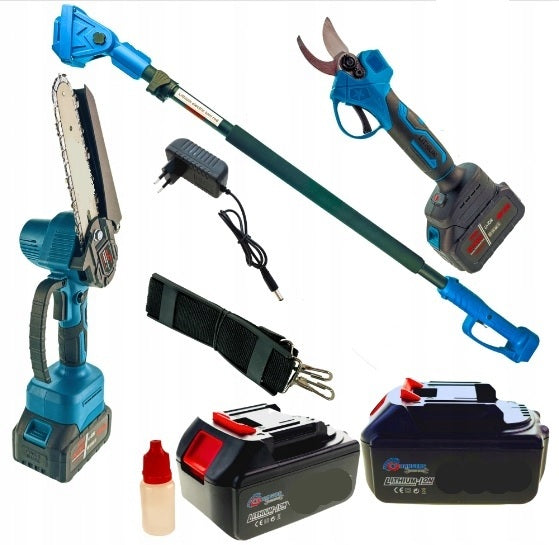 15 cm pjūklo rinkinys + genėjimo žirklės + akumuliatorinė teleskopinė ranka 4 m, 2 akumuliatoriai